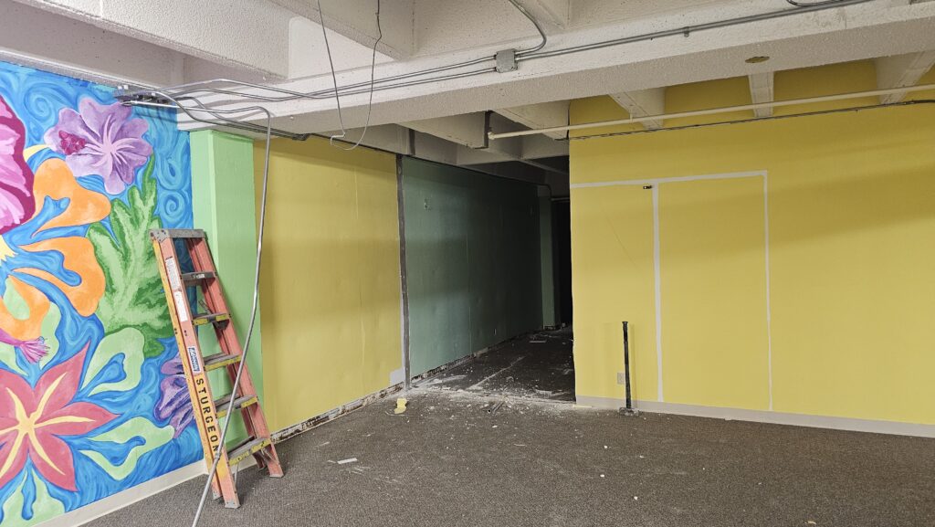 March 5th – View from the Makerspace elevator. Media room door on the right, new Makerspace design area on the left (once the corner and walls are built.)