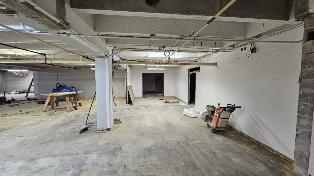 The Library’s basement remodel project has started and is expected to continue at least through late September 2026. This remodel will expand the Makerspace and diversify the services they can offer. In the future, you can expect larger-scale CNC milling, laser cutting, a paint booth, and many other improvements to the Makerspace! The remodel will also update staff office areas to fit current workflows much better.
